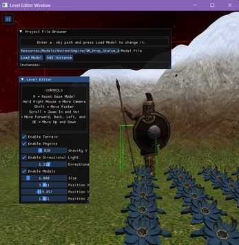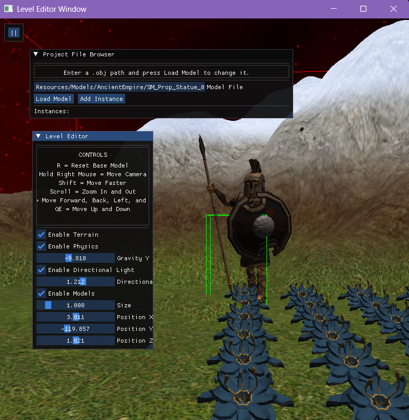 This project is a small game engine, designed to demonstrate key principles of game engine architecture. The engine supports real-time 3D rendering, a flexible object system, integrated physics, runtime GUI editing, and in-engine debugging tools.